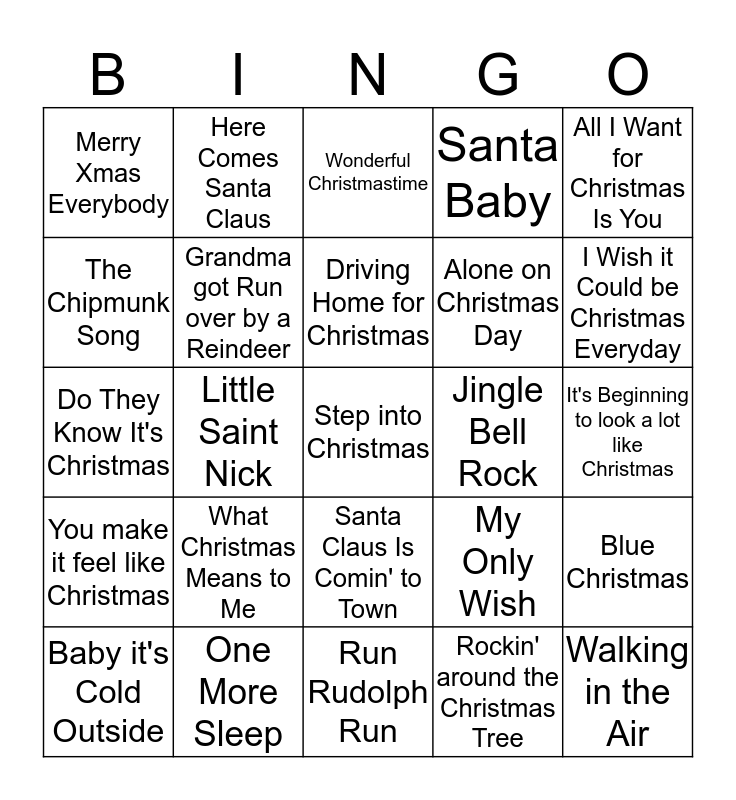 This bingo card has 45 words: Free!, Step into Christmas, Mary's Boy Child, Baby it's Cold Outside, Merry Christmas Everyone, Rockin' around the Christmas Tree, Wonderful Christmastime, Last Christmas, All I Want for Christmas Is You, One More Sleep, Santa Baby, Jingle Bell Rock, Santa Claus Is Comin' to Town, What Christmas Means to Me, Holly Jolly Christmas, Run Rudolph Run, Love Me Like You Do, Do They Know It's Christmas, Lonely This Christmas, I Wish it Could be Christmas Everyday, Here Comes Santa Claus, Happy Xmas, 2000 Miles, Merry Xmas Everybody, Rudolph the Red Nosed Reindeer, It's Beginning to look a lot like Christmas, Santa Tell Me, Let it Snow, My Only Wish, You make it feel like Christmas, I saw Mommy kissing Santa, Blue Christmas, Stop the Calvery, Stay Another Day, Lonely this Christmas, Little Saint Nick, Frosty the Snowman, Mistletoe and Wine, Walking in the Air, Driving Home for Christmas, The Chipmunk Song, Alone on Christmas Day, Christmas All Over Again, Grandma got Run over by a Reindeer and Dominick the Donkey.