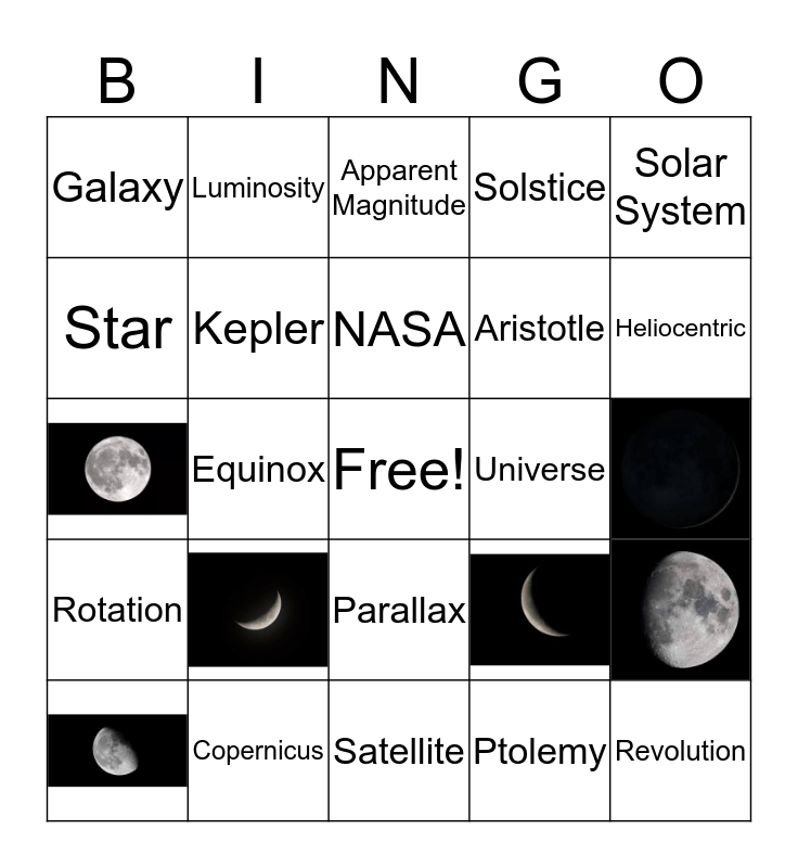 This bingo card has 6 images, a free space and 18 words: Copernicus, NASA, Solar System, Galaxy, Star, Luminosity, Universe, Parallax, Aristotle, Kepler, Ptolemy, Apparent Magnitude, Heliocentric, Equinox, Revolution, Rotation, Solstice and Satellite.