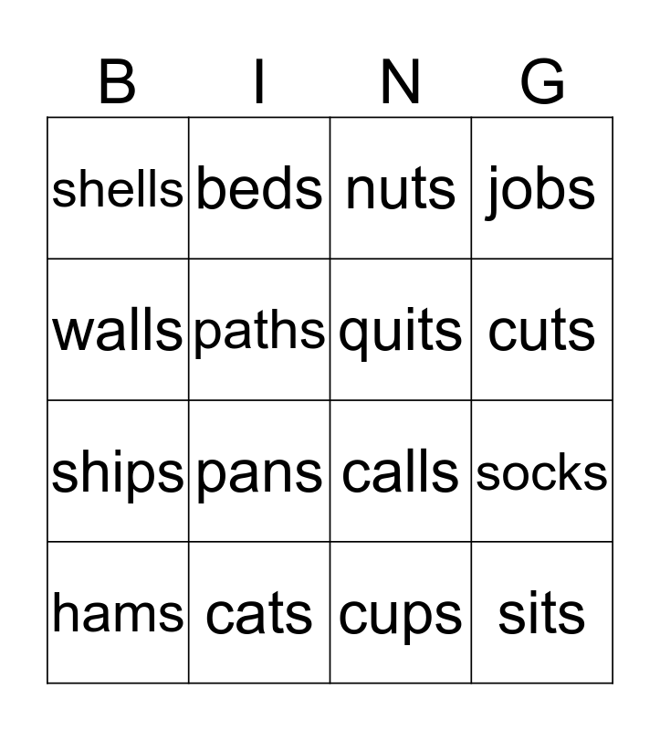 This bingo card has 28 words: tops, ducks, ships, maps, paths, nuts, beds, sits, cats, locks, calls, jobs, kids, rats, pans, sells, checks, quits, cuts, hats, shells, vans, hams, socks, cups, decks, walls and picks.