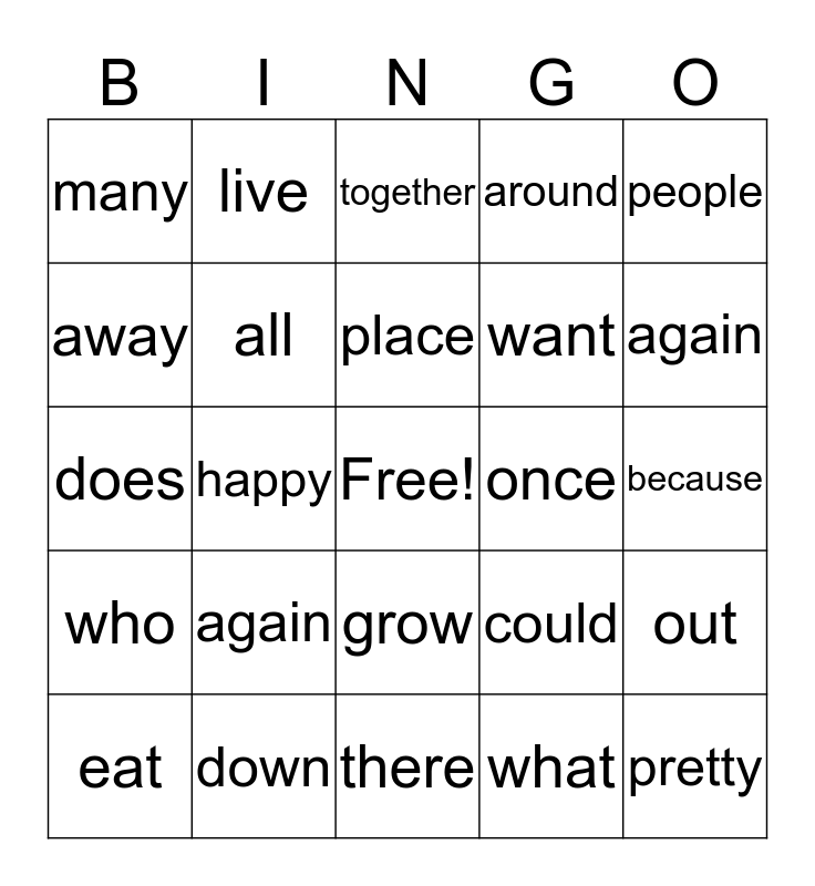 This bingo card has a free space and 24 words: again, down, place, eat, people, many, away, live, once, grow, want, does, could, out, all, what, because, together, again, happy, pretty, who, around and there.