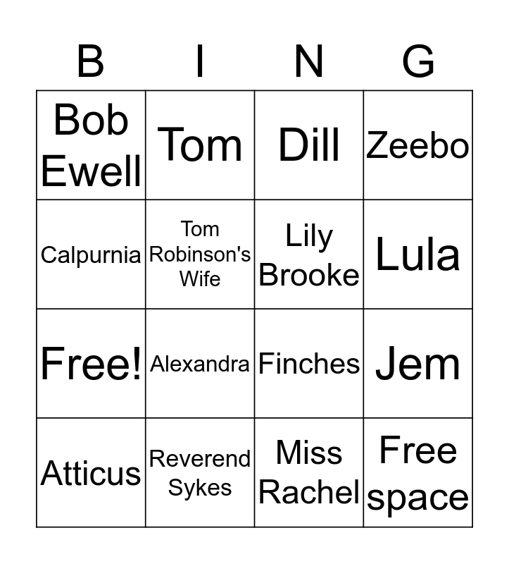This bingo card has 20 words: Jem, Scout, Dill, Maycomb, Atticus, Calpurnia, Reverend Sykes, Bob Ewell, Free!, Tom, Alexandra, Finches, Tom Robinson's Wife, Free space, Lily Brooke, 12, Lula, Zeebo, Miss Rachel and The case.