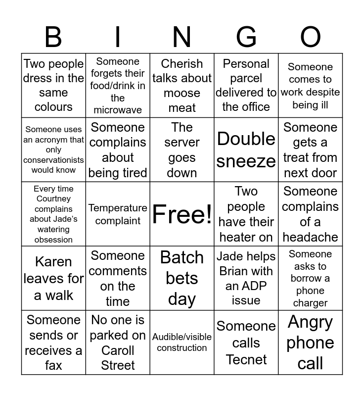 This bingo card has a free space and 38 words: Someone is late to work, Someone eats lunch before 12 pm, No management in the office, Someone complains about being tired, Someone asks to borrow a phone charger, Someone comments on the time, The server goes down, Someone swears, Someone comes to work despite being ill, Double sneeze, Temperature complaint, Personal parcel delivered to the office, Angry phone call, Someone complains of a headache, Someone uses an acronym that only conservationists would know, Karen leaves for a walk, Someone leaves work early, Cherish talks about moose meat, Someone talks about astrology, Two people have their heater on, Two people dress in the same colours, No one is parked on Caroll Street, Someone gets a treat from next door, Someone sends or receives a fax, There is an event on Jutland, Audible/visible construction, Someone recommends a book/movie/etc to someone else, Proponent/stakeholder drops by unexpectedly, Leaf blower, Brian walks by whistling, Calls/emails for licences/injured wildlife, Batch bets day, Someone calls Tecnet, Someone forgets their food/drink in the microwave, Cherish talks about moose meat, Jade helps Brian with an ADP issue, Every time Courtney complains about Jade’s watering obsession and When either Jade/Cherish/or Sarah leave work early.