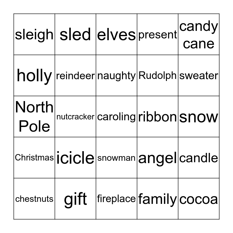 This bingo card has a free space and 54 words: December, Christmas, Merry, stocking, snowman, wreath, present, reindeer, holly, mistletoe, sleigh, lights, gift, chestnuts, Santa, fireplace, cocoa, Rudolph, cookies, snow, angel, tree, ribbon, candy cane, poinsettia, sled, Grinch, ornament, chimney, family, star, bell, cards, candy, elves, manger, North Pole, candle, scarf, reindeer, Eve, egg nog, Feliz Navidad, Frosty, icicle, Jingle Bells, list, mittens, naughty, nutcracker, sweater, wrapping paper, workshop and travel.
