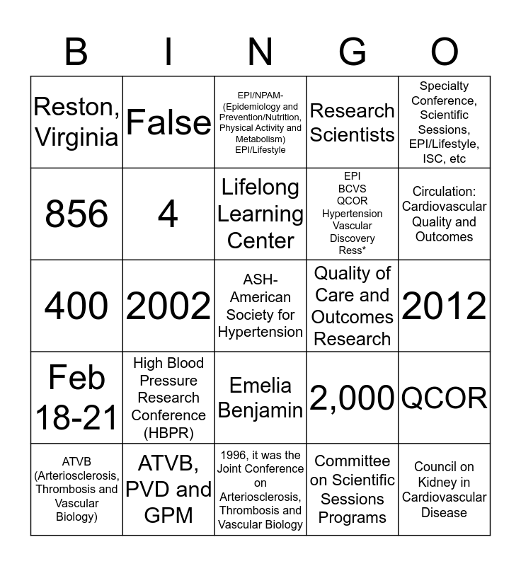 This bingo card has 36 words: 60 days, 5 years, 1976, 4, 2,000, Feb 18-21, Lifelong Learning Center, Physicians, Nurses, EMT, Pharmacist, Specialty Conference, Scientific Sessions, EPI/Lifestyle, ISC, etc, Basic Cardiovascular Sciences, 2002, Research Scientists, Free!, Quality of Care and Outcomes Research, Circulation: Cardiovascular Quality and Outcomes, Reston, Virginia, Council on Kidney in Cardiovascular Disease, High Blood Pressure Research Conference (HBPR), ASH- American Society for Hypertension, EPI/NPAM- (Epidemiology and Prevention/Nutrition, Physical Activity and Metabolism) EPI/Lifestyle, 2012, QCOR, ATVB, PVD and GPM, ATVB (Arteriosclerosis, Thrombosis and Vascular Biology), 1996, it was the Joint Conference on Arteriosclerosis, Thrombosis and Vascular Biology, False, 400, 6, EPI BCVS QCOR Hypertension Vascular Discovery Ress*, 856, ISCHEMIA, 1926, Committee on Scientific Sessions Programs, Emelia Benjamin, SACC and Science and Clinical Education Lifelong Learning Committee.