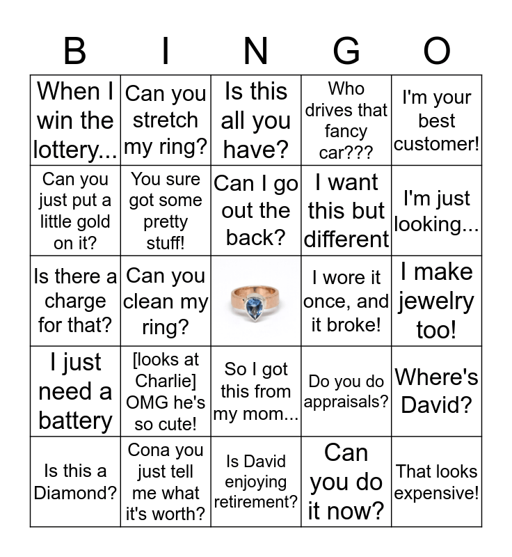 This bingo card has a free space and 24 words: [looks at Charlie] OMG he's so cute!, Cona you just tell me what it's worth?, Can I go out the back?, Is this a Diamond?, I'm your best customer!, When I win the lottery..., Can you just put a little gold on it?, Can you stretch my ring?, I wore it once, and it broke!, So I got this from my mom..., I want this but different, Is there a charge for that?, Do you do appraisals?, Where's David?, You sure got some pretty stuff!, Can you do it now?, I make jewelry too!, Is this all you have?, I'm just looking..., Can you clean my ring?, That looks expensive!, I just need a battery, Who drives that fancy car??? and Is David enjoying retirement?.