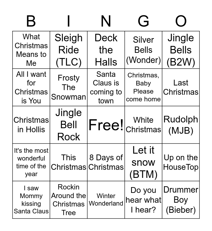 This bingo card has a free space and 24 words: This Christmas, Rockin Around the Christmas Tree, Santa Claus is coming to town, I saw Mommy kissing Santa Claus, Jingle Bells (B2W), What Christmas Means to Me, All I want for Christmas is You, Sleigh Ride (TLC), White Christmas, 8 Days of Christmas, Christmas, Baby Please come home, Christmas in Hollis, Let it snow (BTM), Up on the HouseTop, Frosty The Snowman, Do you hear what I hear?, Rudolph (MJB), Deck the Halls, Last Christmas, Jingle Bell Rock, Drummer Boy (Bieber), It's the most wonderful time of the year, Silver Bells (Wonder) and Winter Wonderland.