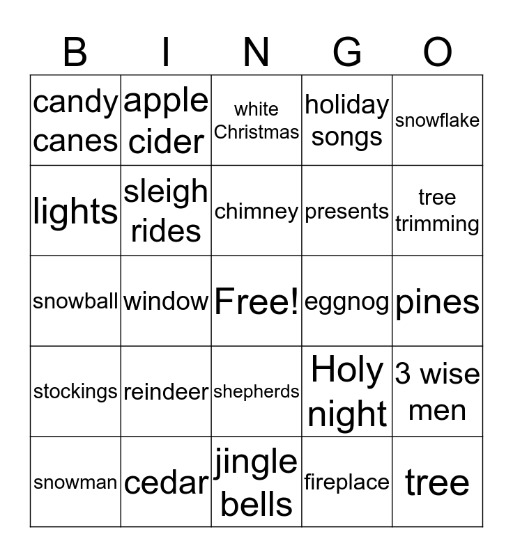 This bingo card has a free space and 30 words: cedar, truck, window, pajamas, candy canes, white Christmas, sleigh rides, shepherds, eggnog, jingle bells, pines, tree, fireplace, Baby Jesus, tree trimming, parties, Holy night, stockings, reindeer, snowflake, snowball, hot chocolate, apple cider, presents, lights, holiday songs, 3 wise men, snowman, chimney and Rudolph.