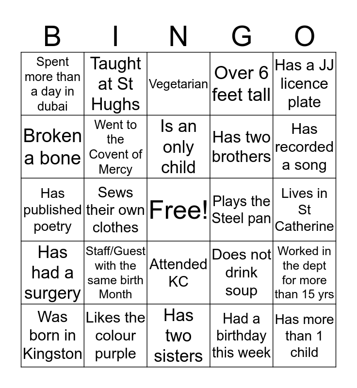 This bingo card has a free space and 24 words: Staff/Guest with the same birth Month, Likes the colour purple, Is an only child, Was born in Kingston, Has a JJ licence plate, Spent more than a day in dubai, Broken a bone, Taught at St Hughs, Plays the Steel pan, Attended KC, Has two brothers, Has published poetry, Does not drink soup, Worked in the dept for more than 15 yrs, Went to the Covent of Mercy, Had a birthday this week, Lives in St Catherine, Vegetarian, Has recorded a song, Sews their own clothes, Has more than 1 child, Has had a surgery, Over 6 feet tall and Has two sisters.