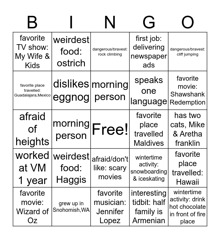 This bingo card has a free space and 26 words: afraid/don't like: scary movies, interesting tidbit: half family is Armenian, morning person, grew up in Snohomish,WA, dangerous/bravest: cliff jumping, favorite TV show: My Wife & Kids, favorite place travelled: Guadalajara,Mexico, weirdest food: ostrich, has two cats, Mike & Aretha franklin, wintertime activity: snowboarding & iceskating, speaks one language, afraid of heights, favorite place travelled: Hawaii, favorite movie: Wizard of Oz, morning person, weirdest food: palm fruit, first job: delivering newspaper ads, worked at VM 1 year, dangerous/bravest: rock climbing, wintertime activity: drink hot chocolate in front of fire place, favorite movie: Shawshank Redemption, favorite musician: Jennifer Lopez, favorite place travelled Maldives, weirdest food: Haggis, dislikes eggnog and likes snow.