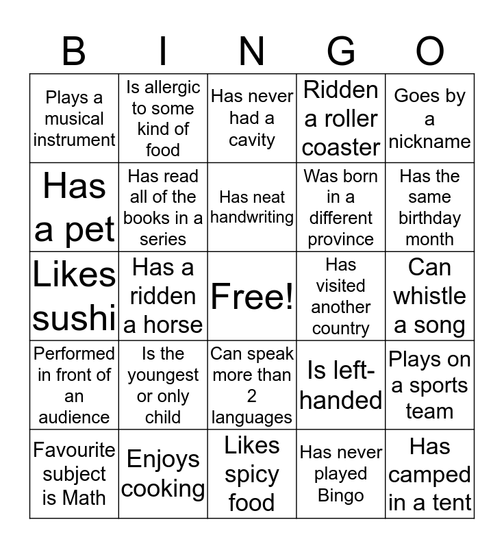 This bingo card has a free space and 24 words: Is the youngest or only child, Enjoys cooking, Has neat handwriting, Favourite subject is Math, Goes by a nickname, Plays a musical instrument, Has a pet, Is allergic to some kind of food, Has visited another country, Can speak more than 2 languages, Was born in a different province, Likes sushi, Is left-handed, Plays on a sports team, Has read all of the books in a series, Has never played Bingo, Can whistle a song, Has never had a cavity, Has the same birthday month, Has a ridden a horse, Has camped in a tent, Performed in front of an audience, Ridden a roller coaster and Likes spicy food.