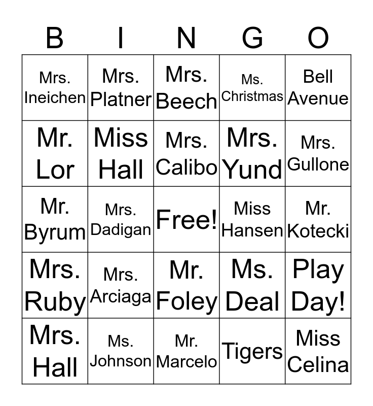 This bingo card has a free space and 29 words: Mrs. Hall, Mr. Weeks, Mrs. Dadigan, Miss Hardin, Mrs. Ineichen, Mrs. Beech, Miss Hall, Mrs. Arciaga, Miss Hansen, Ms. Johnson, Mr. Kotecki, Miss Celina, Mr. Marcelo, Tigers, Mrs. Gullone, Miss Cori, Mr. Foley, Mrs. Ruby, Bell Avenue, Mr. Byrum, Ms. Deal, Nurse Judy, Mrs. Yund, Mr. Lor, Ms. Christmas, Mrs. Platner, Play Day!, Mrs. Calibo and Miss Chris.