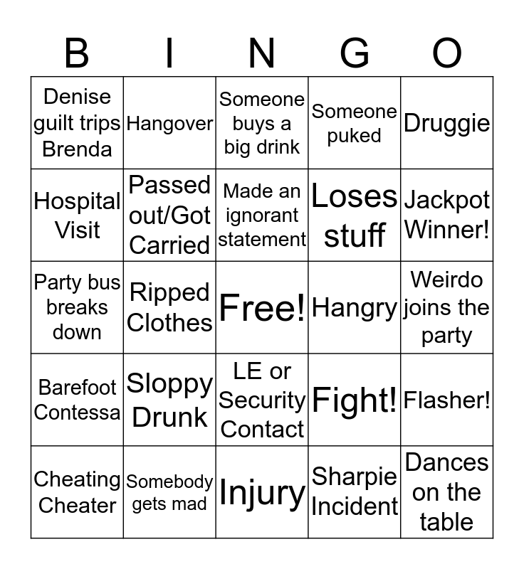 This bingo card has a free space and 24 words: Sloppy Drunk, Somebody gets mad, Made an ignorant statement, Cheating Cheater, Druggie, Denise guilt trips Brenda, Hospital Visit, Hangover, Hangry, LE or Security Contact, Loses stuff, Party bus breaks down, Fight!, Flasher!, Passed out/Got Carried, Sharpie Incident, Weirdo joins the party, Someone buys a big drink, Jackpot Winner!, Ripped Clothes, Dances on the table, Barefoot Contessa, Someone puked and Injury.