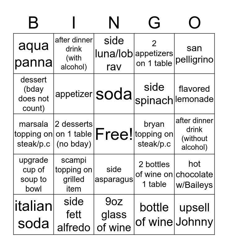This bingo card has a free space and 24 words: scampi topping on grilled item, side fett alfredo, soda, italian soda, san pelligrino, aqua panna, dessert (bday does not count), after dinner drink (with alcohol), bryan topping on steak/p.c, side asparagus, side spinach, marsala topping on steak/p.c, 2 bottles of wine on 1 table, hot chocolate w/Baileys, appetizer, bottle of wine, after dinner drink (without alcohol), side luna/lob rav, flavored lemonade, 2 desserts on 1 table (no bday), upsell Johnny, upgrade cup of soup to bowl, 2 appetizers on 1 table and 9oz glass of wine.
