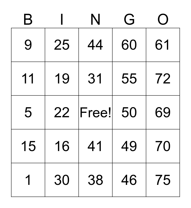 This bingo card has a free space and 24 words: 1, 16, 31, 46, 61, 9, 25, 44, 50, 69, 5, 19, 49, 70, 11, 30, 38, 60, 72, 15, 22, 41, 55 and 75.