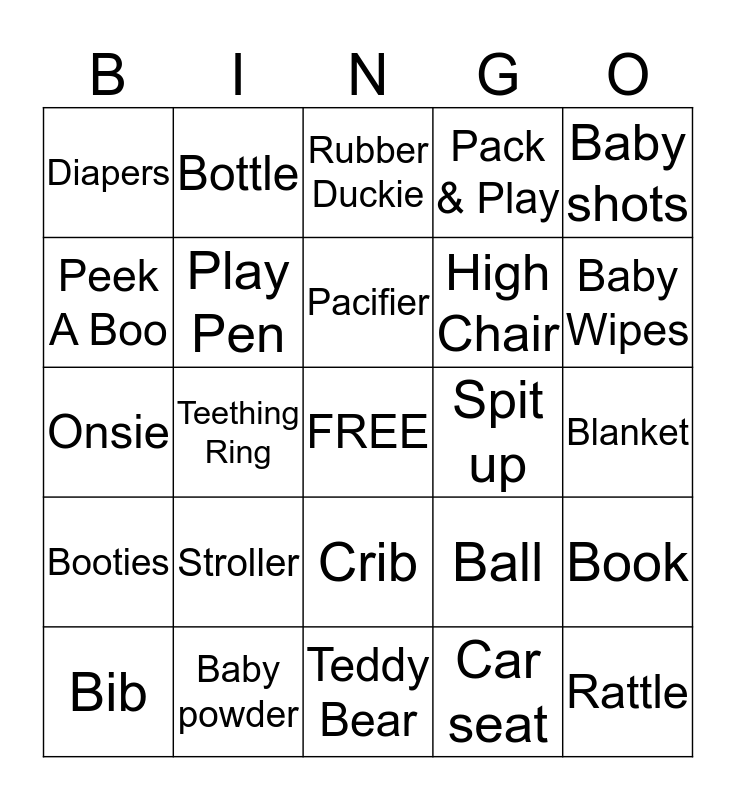 This bingo card has a free space and 24 words: Stroller, Baby powder, Pacifier, Bib, Baby shots, Diapers, Peek A Boo, Bottle, Spit up, Crib, High Chair, Onsie, Ball, Book, Play Pen, Car seat, Blanket, Rubber Duckie, Baby Wipes, Teething Ring, Rattle, Booties, Pack & Play and Teddy Bear.