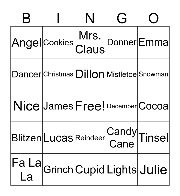 This bingo card has a free space and 73 words: Alisa, Andy, Angel, Bells, Bird, Bishop, Blitzen, Bow, Candy Cane, Carol, Chelsee, Chimney, Christmas, Cocoa, Comet, Cookies, Cupid, Dancer, Dasher, December, Dillon, Donner, Emma, Eric, Fa La La, Family, Frosty, Fruitcake, Garland, Gingerbread, Grinch, Ho Ho Ho, Hollee, Icicles, James, Jingle, Jolly, Jon, Julie, Lee, Lights, Lucas, Megan, Merry, Milk, Mistletoe, Mrs. Claus, Nativity, Naughty, Nice, Noel, North Pole, Ornaments, Phares, Poinsettia, Prancer, Presents, Reindeer, Rudolph, Santa, Scott, Sleigh, Snowflake, Snowman, Star, Stockings, Taylor, Terry, Tinsel, Todd, Toys, Tree Vixen and Wreath.