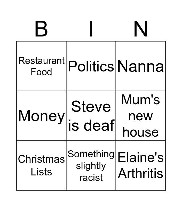 This bingo card has a free space and 8 words: Mum's new house, Nanna, Politics, Christmas Lists, Restaurant Food, Elaine's Arthritis, Money and Something slightly racist.