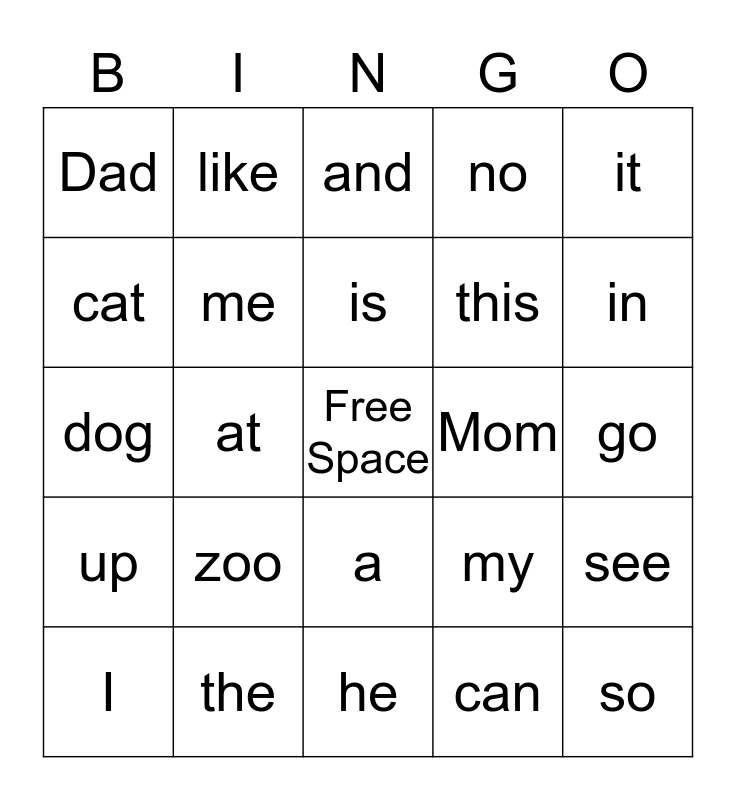 This bingo card has a free space and 24 words: zoo, the, is, I, it, Dad, cat, like, Mom, a, this, dog, my, see, me, can, go, and, in, at, so, up, no and he.