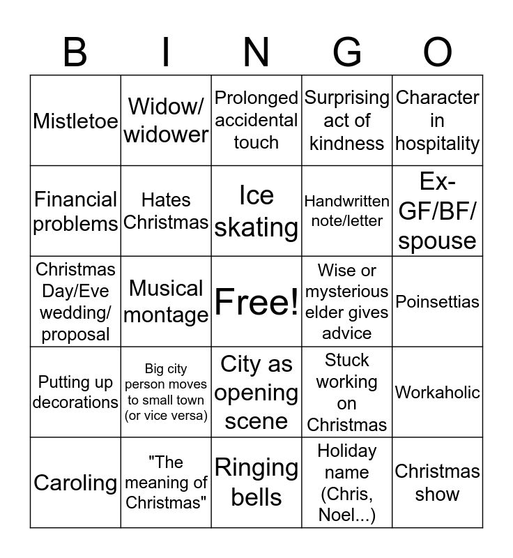 This bingo card has a free space and 34 words: Interrupted first kiss, Holiday name (Chris, Noel...), Christmas wish, Snow falling, Putting up decorations, Hates Christmas, Character in hospitality, Caroling, Widow/ widower, Hot chocolate, Ice skating, Prolonged accidental touch, Baking/cooking, Misunderstandings caused breakup, Wise or mysterious elder gives advice, Ex-GF/BF/ spouse, "The meaning of Christmas", Christmas Day/Eve wedding/ proposal, Big city person moves to small town (or vice versa), Stuck working on Christmas, City as opening scene, Scheming family member, Mistletoe, Poinsettias, Ringing bells, Christmas show, Surprising act of kindness, Company going out of business, Handwritten note/letter, Financial problems, Sassy best friend, Musical montage, Workaholic and Loses job.