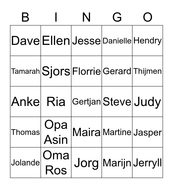This bingo card has a free space and 24 words: Opa Asin, Oma Ros, Florrie, Jolande, Hendry, Dave, Tamarah, Ellen, Steve, Maira, Gerard, Anke, Martine, Jasper, Sjors, Marijn, Judy, Jesse, Thijmen, Ria, Jerryll, Thomas, Danielle and Jorg.