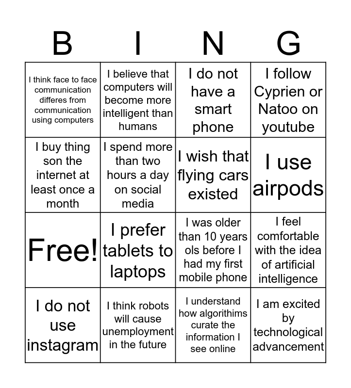 This bingo card has 20 words: I feel comfortable with the idea of artificial intelligence, I have used a chat site, I do not have a smart phone, I use a Mac and not a PC, I do not use instagram, I buy thing son the internet at least once a month, I think robots will cause unemployment in the future, I think face to face communication differes from communication using computers, Free!, I believe that computers will become more intelligent than humans, I prefer tablets to laptops, I was older than 10 years ols before I had my first mobile phone, I spend more than two hours a day on social media, I am excited by technological advancement, I wish that flying cars existed, I have fact checked an article I found online, I use airpods, I follow Cyprien or Natoo on youtube, I understand how algorithims curate the information I see online and I think robots should be used for health.