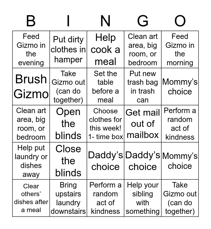 This bingo card has a free space and 24 words: Close the blinds, Bring upstairs laundry downstairs, Set the table before a meal, Clear others’ dishes after a meal, Feed Gizmo in the morning, Feed Gizmo in the evening, Brush Gizmo, Put dirty clothes in hamper, Get mail out of mailbox, Daddy’s choice, Put new trash bag in trash can, Clean art area, big room, or bedroom, Daddy’s choice, Mommy’s choice, Take Gizmo out (can do together), Help your sibling with something, Perform a random act of kindness, Help cook a meal, Mommy’s choice, Open the blinds, Take Gizmo out (can do together), Help put laundry or dishes away, Clean art area, big room, or bedroom and Perform a random act of kindness.