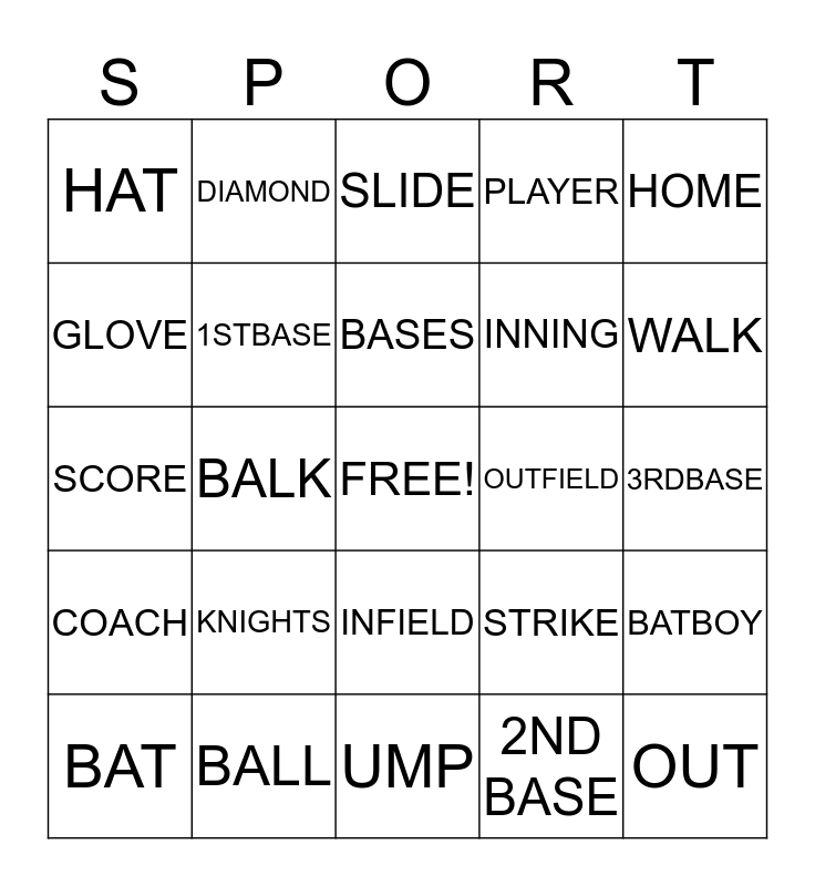 This bingo card has a free space and 24 words: KNIGHTS, BALL, BASES, BAT, HOME, HAT, GLOVE, DIAMOND, OUTFIELD, INFIELD, INNING, SCORE, STRIKE, BATBOY, 1STBASE, 2ND BASE, 3RDBASE, SLIDE, WALK, BALK, OUT, COACH, PLAYER and UMP.
