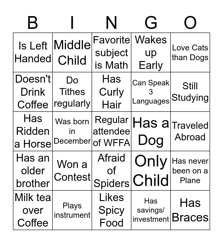 This bingo card has 25 words: Has an older brother, Plays instrument, Regular attendee of WFFA, Has savings/ investment, Love Cats than Dogs, Is Left Handed, Middle Child, Favorite subject is Math, Has a Dog, Has never been on a Plane, Doesn't Drink Coffee, Do Tithes regularly, Likes Spicy Food, Only Child, Still Studying, Milk tea over Coffee, Was born in December, Has Curly Hair, Can Speak 3 Languages, Traveled Abroad, Has Ridden a Horse, Won a Contest, Afraid of Spiders, Wakes up Early and Has Braces.