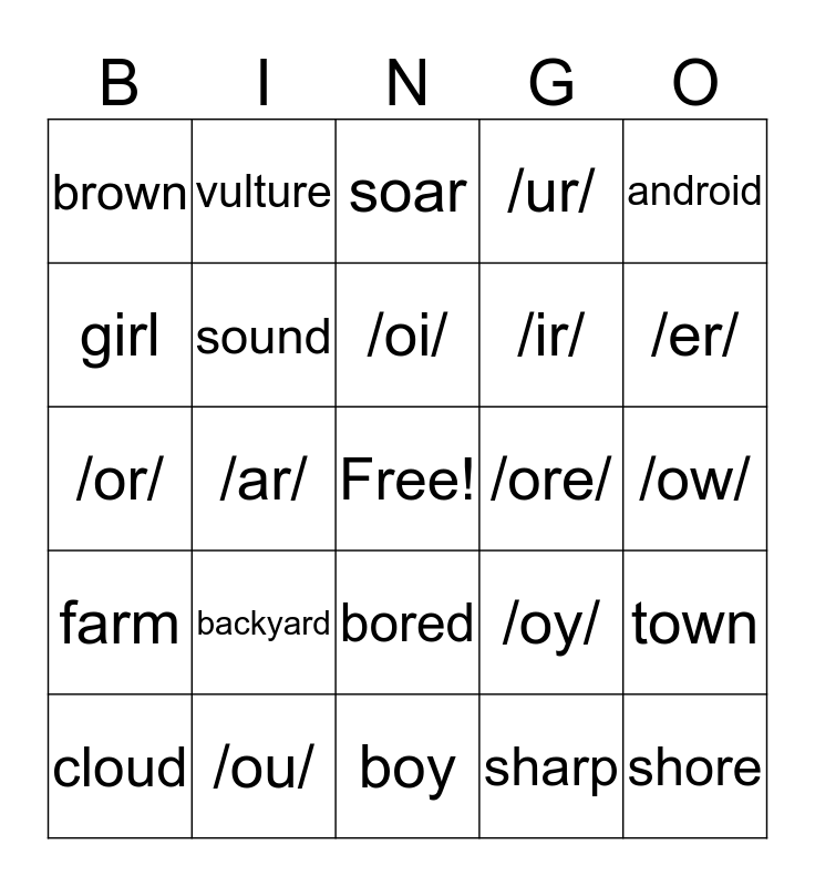 This bingo card has a free space and 24 words: backyard, /ou/, /oi/, cloud, android, brown, girl, vulture, /ore/, bored, /ir/, /or/, /oy/, town, sound, sharp, /ow/, soar, /er/, /ar/, shore, farm, /ur/ and boy.