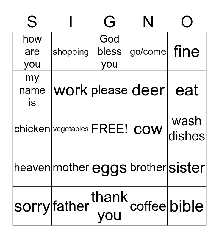 This bingo card has a free space and 24 words: mother, father, please, sorry, fine, how are you, my name is, shopping, cow, eggs, deer, chicken, brother, sister, work, coffee, wash dishes, God bless you, eat, vegetables, bible, heaven, go/come and thank you.