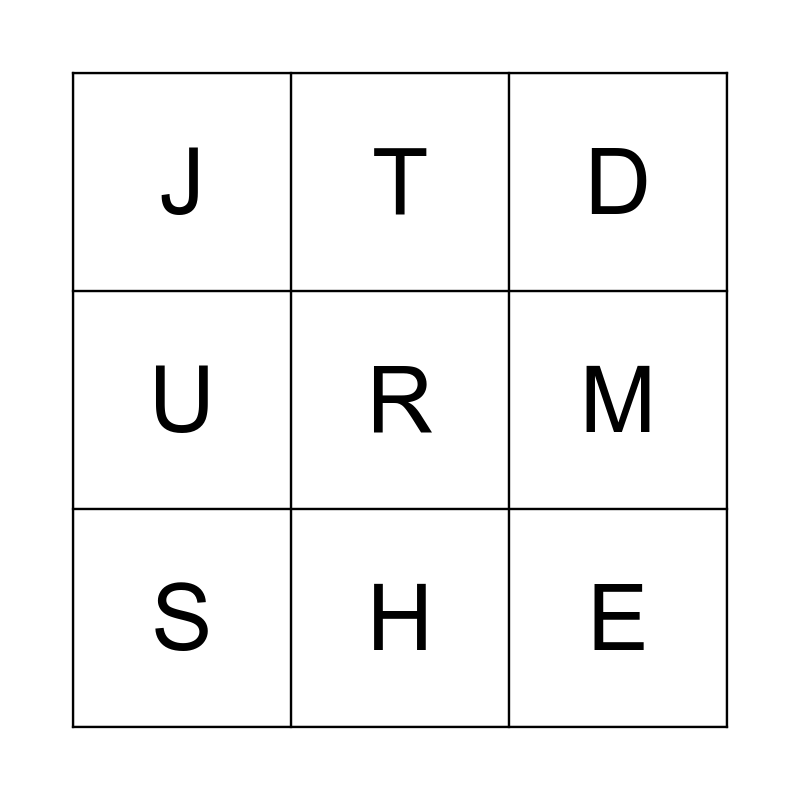 This bingo card has 9 words: S, D, T, U, J, M, R, E and H.