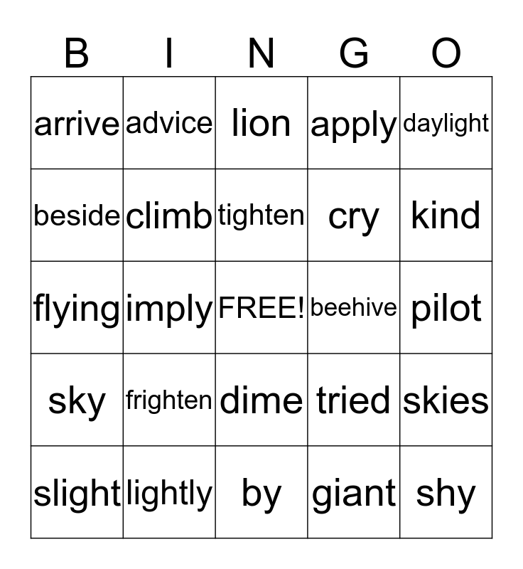 This bingo card has a free space and 24 words: frighten, lightly, tighten, slight, daylight, arrive, beside, advice, beehive, dime, cry, flying, tried, skies, climb, giant, pilot, lion, kind, imply, shy, sky, apply and by.