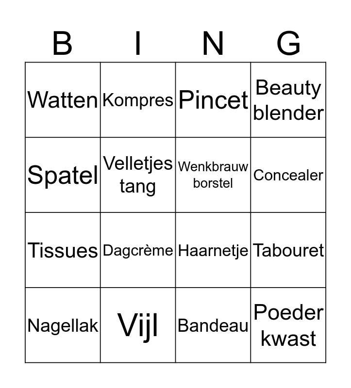 This bingo card has 16 words: Vijl, Tabouret, Pincet, Watten, Tissues, Kompres, Haarnetje, Bandeau, Spatel, Velletjes tang, Nagellak, Beauty blender, Dagcrème, Concealer, Wenkbrauw borstel and Poeder kwast.