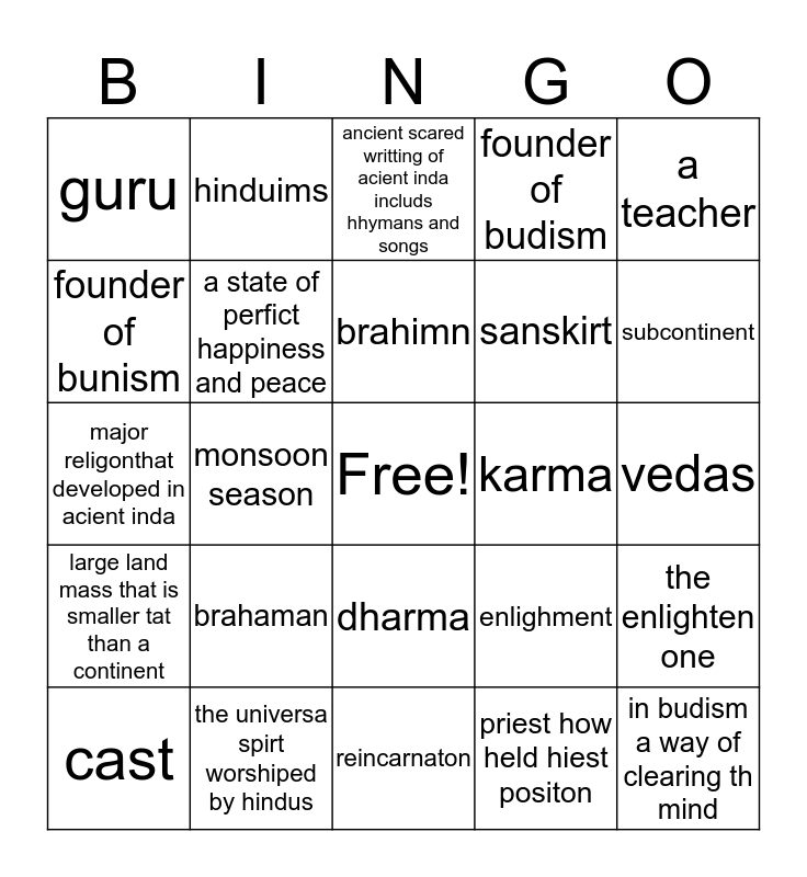 This bingo card has a free space and 24 words: brahaman, the universa spirt worshiped by hindus, brahimn, cast, a teacher, guru, founder of bunism, hinduims, karma, dharma, sanskirt, major religonthat developed in acient inda, enlighment, the enlighten one, a state of perfict happiness and peace, priest how held hiest positon, vedas, ancient scared writting of acient inda includs hhymans and songs, subcontinent, monsoon season, in budism a way of clearing th mind, large land mass that is smaller tat than a continent, founder of budism and reincarnaton.
