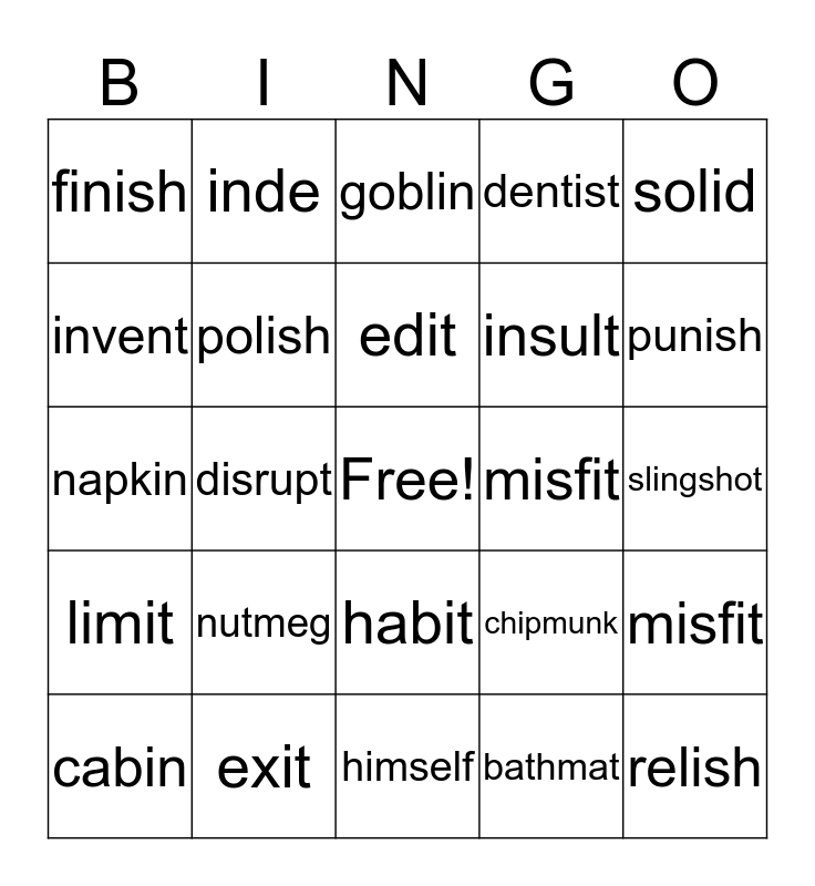 This bingo card has a free space and 34 words: upset, bathmat, catfish, publish, limit, polish, solid, cabin, inde, mascot, edit, goblin, combat, until, misfit, punish, exit, napkin, nutmeg, chipmunk, habit, robin, finish, slingshot, himself, relish, dentist, pumpkin, insult, invent, blindfold, disrupt, misfit and splinded.
