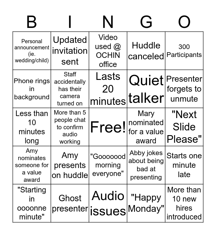 This bingo card has a free space and 29 words: "Starting in oooonne minute", "Good morning OCHIN!", More than 5 people chat to confirm audio working, No one has any updates to share, Personal announcement (ie. wedding/child), Video used @ OCHIN office, Staff accidentally has their camera turned on, Amy presents on huddle, Mary nominated for a value award, Ghost presenter, "Next Slide Please", More than 10 new hires introduced, Audio issues, "Happy Monday", Presenter forgets to unmute, Um used >5 times by a single presenter, "Gooooood morning everyone", Amy nominates someone for a value award, 300 Participants, Less than 10 minutes long, Abby jokes about being bad at presenting, Loud talker, Quiet talker, Phone rings in background, Huddle canceled, Updated invitation sent, Starts one minute late, Lasts 20 minutes and Dog barking.
