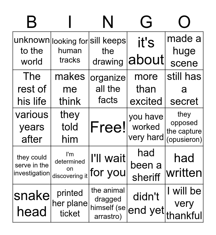 This bingo card has a free space and 27 words: had been a sheriff, the letter, more than excited, the animal dragged himself (se arrastro), The rest of his life, sill keeps the drawing, looking for human tracks, they could serve in the investigation, you have worked very hard, had written, various years after, it's about, snake head, printed her plane ticket, still has a secret, turned on the computer, makes me think, organize all the facts, I'm determined on discovering it, unknown to the world, they opposed the capture (opusieron), didn't end yet, they told him, I will be very thankful, I'll wait for you, made a huge scene and the dream of a lifetime.