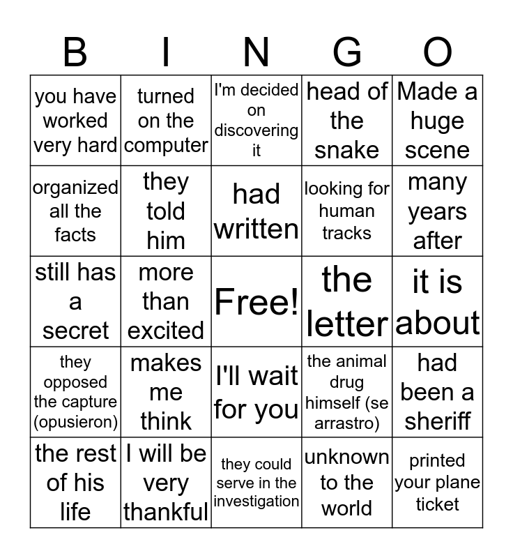 This bingo card has a free space and 27 words: the animal drug himself (se arrastro), still keeps the drawing, looking for human tracks, they could serve in the investigation, organized all the facts, I'm decided on discovering it, turned on the computer, they opposed the capture (opusieron), the letter, had been a sheriff, still has a secret, head of the snake, the rest of his life, I will be very thankful, many years after, didn't end yet, they told him, had written, makes me think, you have worked very hard, it is about, unknown to the world, more than excited, printed your plane ticket, I'll wait for you, Made a huge scene and The dream of a lifetime.