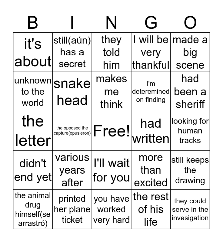 This bingo card has a free space and 27 words: more than excited, turned on the computer, I'm deteremined on finding, you have worked very hard, unknown to the world, they told him, still(aún) has a secret, didn't end yet, had written, still keeps the drawing, the letter, I will be very thankful, the animal drug himself(se arrastró), printed her plane ticket, had been a sheriff, organized all the facts, snake head, makes me think, various years after, it's about, looking for human tracks, the rest of his life, the opposed the capture(opusieron), they could serve in the invesigation, I'll wait for you, made a big scene and dream of a lifetime.