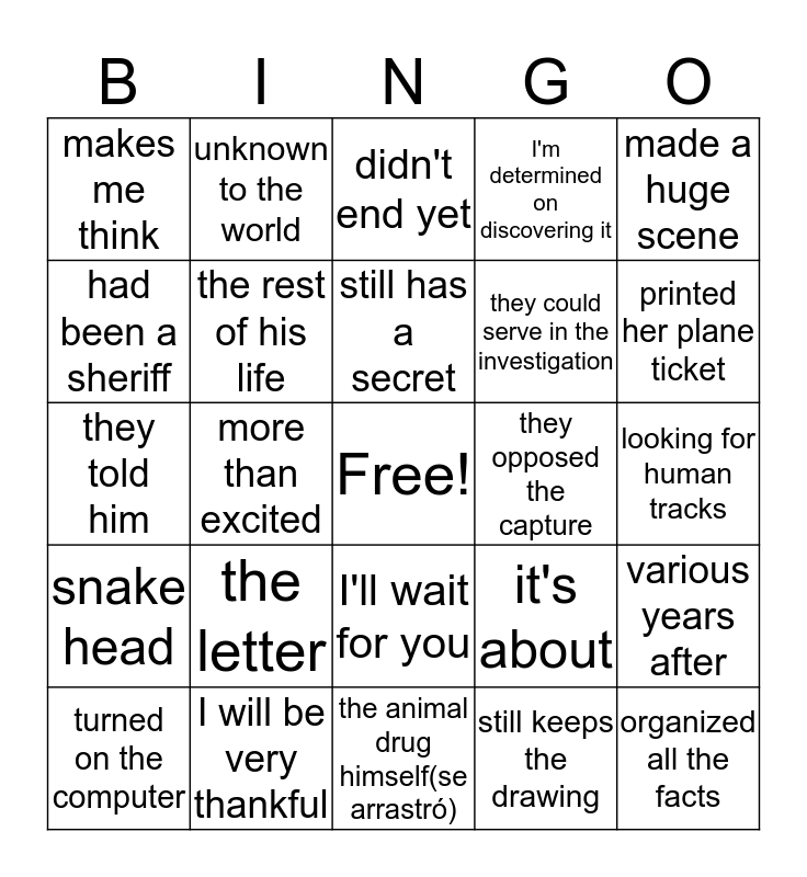 This bingo card has a free space and 27 words: it's about, had written, they could serve in the investigation, the animal drug himself(se arrastró), had been a sheriff, didn't end yet, unknown to the world, snake head, they opposed the capture, various years after, they told him, I'm determined on discovering it, turned on the computer, I will be very thankful, printed her plane ticket, you have worked very hard, the rest of his life, still has a secret, the letter, makes me think, looking for human tracks, still keeps the drawing, more than excited, organized all the facts, I'll wait for you, made a huge scene and a dream of a lifetime.