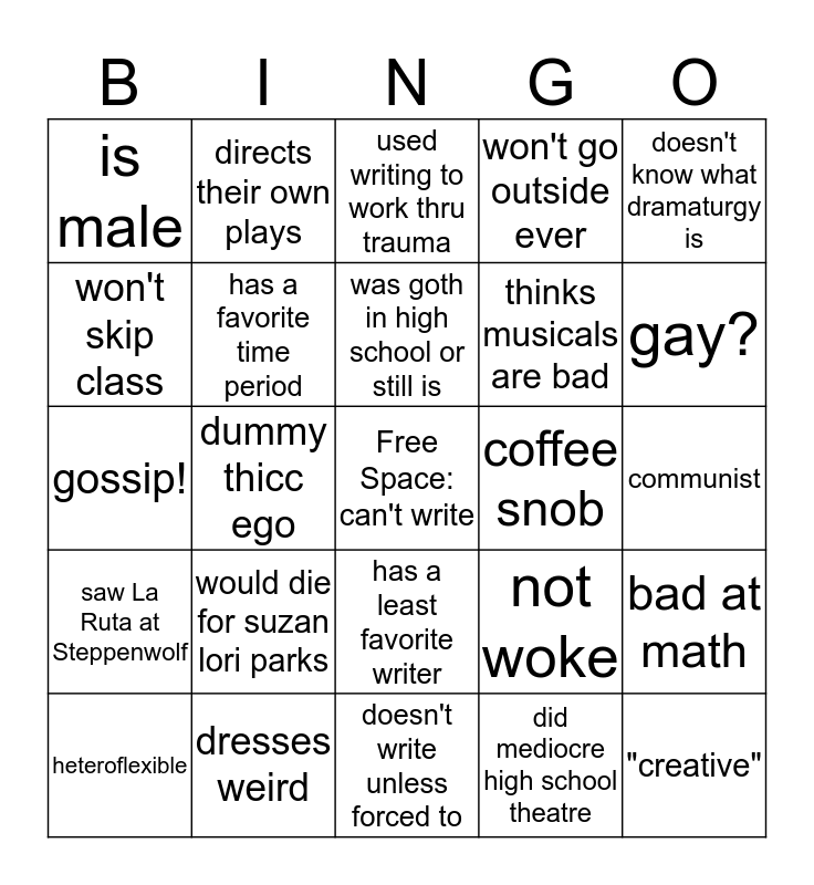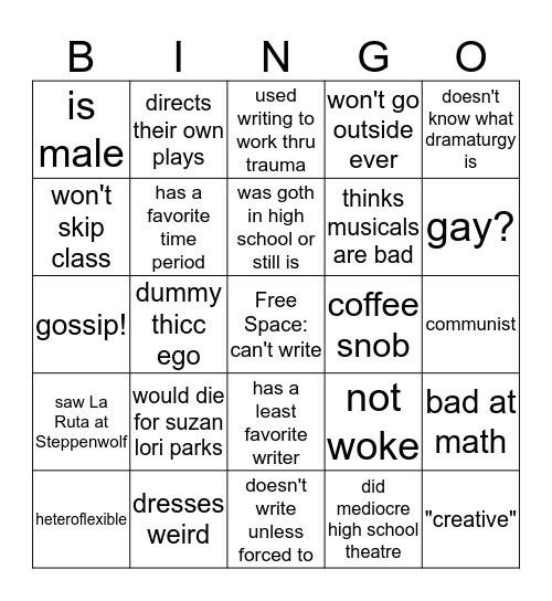This bingo card has a free space and 24 words: would die for suzan lori parks, dresses weird, was goth in high school or still is, heteroflexible, doesn't know what dramaturgy is, is male, won't skip class, directs their own plays, coffee snob, has a least favorite writer, thinks musicals are bad, gossip!, not woke, bad at math, has a favorite time period, did mediocre high school theatre, communist, used writing to work thru trauma, gay?, dummy thicc ego, "creative", saw La Ruta at Steppenwolf, won't go outside ever and doesn't write unless forced to.
