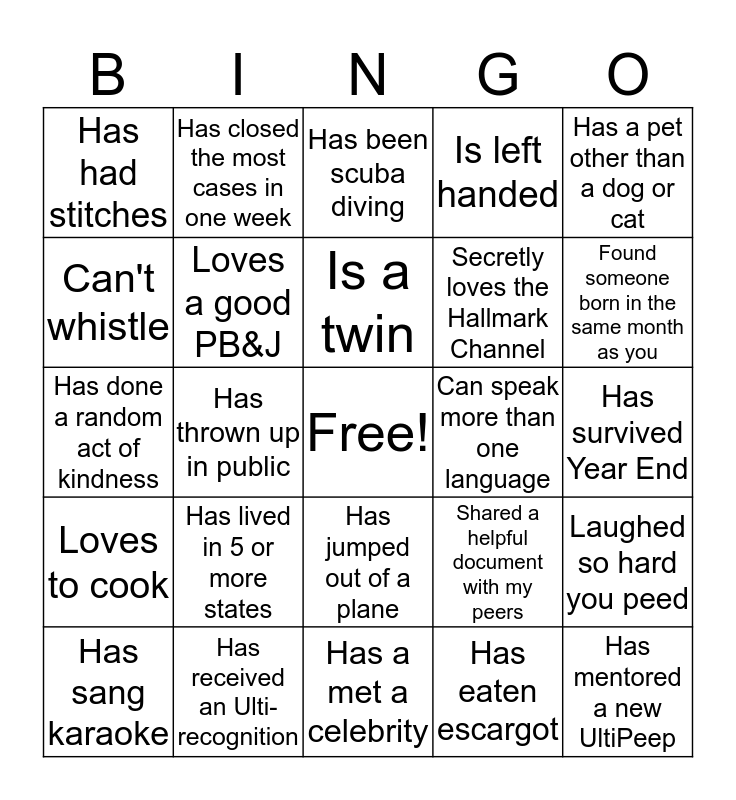 This bingo card has a free space and 24 words: Has lived in 5 or more states, Has received an Ulti-recognition, Is a twin, Has sang karaoke, Has a pet other than a dog or cat, Has had stitches, Can't whistle, Has closed the most cases in one week, Can speak more than one language, Has jumped out of a plane, Secretly loves the Hallmark Channel, Has done a random act of kindness, Shared a helpful document with my peers, Laughed so hard you peed, Loves a good PB&J, Has eaten escargot, Has survived Year End, Has been scuba diving, Found someone born in the same month as you, Has thrown up in public, Has mentored a new UltiPeep, Loves to cook, Is left handed and Has a met a celebrity.