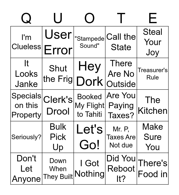 This bingo card has 25 words: Bulk Pick Up, I Got Nothing, Hey Dork, Don't Let Anyone, Steal Your Joy, I'm Clueless, It Looks Janke, User Error, Are You Paying Taxes?, Let's Go!, There Are No Outside, Specials on this Property, Mr. P, Taxes Are Not due, Make Sure You, Shut the Frig, There's Food in, The Kitchen, "Stampede Sound", Treasurer's Rule, Clerk's Drool, Booked My Flight to Tahiti, Down When They Built, Seriously?, Call the State and Did You Reboot It?.