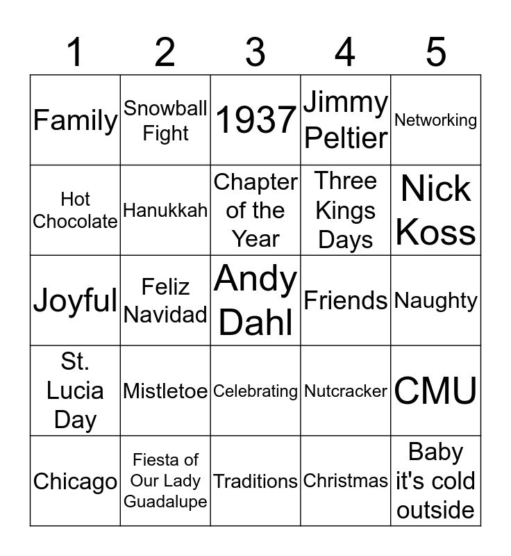 This bingo card has 61 words: Gift, Fiesta of Our Lady Guadalupe, Caroling, St. Lucia Day, Christmas, Hyland Hall, Hanukkah, Kwanzaa, Three Kings Days, Ugly Sweater, Jimmy Peltier, Pavan C, Hot Chocolate, Snow, Egg Nog, Family, Andy Dahl, Networking, John DeGraff, Chapter of the Year, Friends, 1937, Chicago, CMU, Sales, Sam Wanezek, Kate Ameriling, Abby Werkowski, Nick Koss, Cookies, Brianna Oelke, Lauren Tripoli, Marketing, UWW, Snowball Fight, Gingerbread House, Dreidel, Feliz Navidad, Grinch, Joyful, Kinara, Mistletoe, Naughty, Nice, Nutcracker, Winter Solstice, Snowman, Menorah, Sledding, Celebrating, Traditions, Let it Snow, Holidays, Happy, Jolly, Season Greetings, Memories, Peace, Icicle, Baby it's cold outside and Jingle Bell Rock.