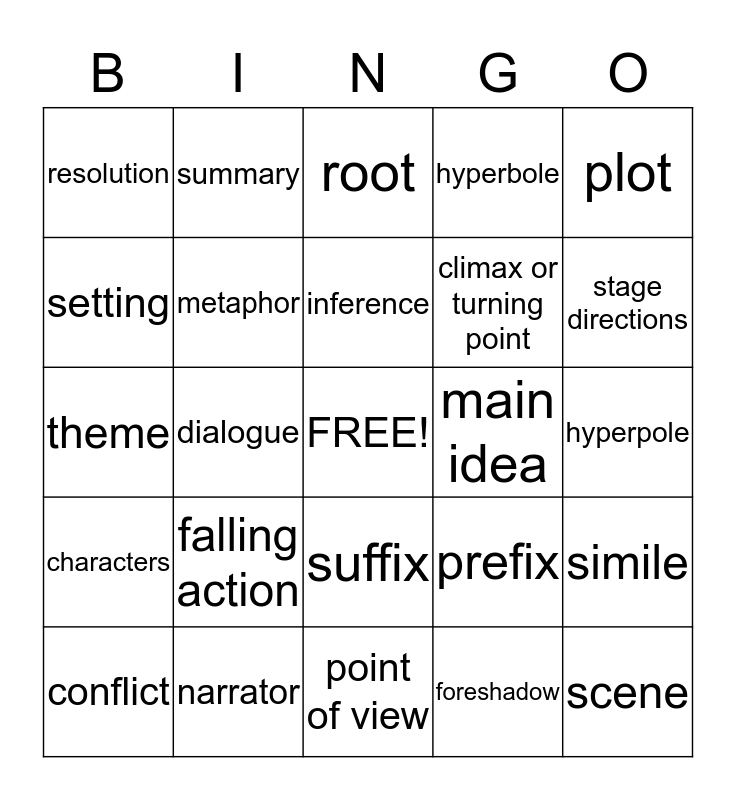 This bingo card has a free space and 24 words: falling action, narrator, inference, conflict, plot, resolution, setting, summary, main idea, suffix, climax or turning point, theme, prefix, simile, metaphor, foreshadow, hyperpole, root, stage directions, dialogue, scene, characters, hyperbole and point of view.