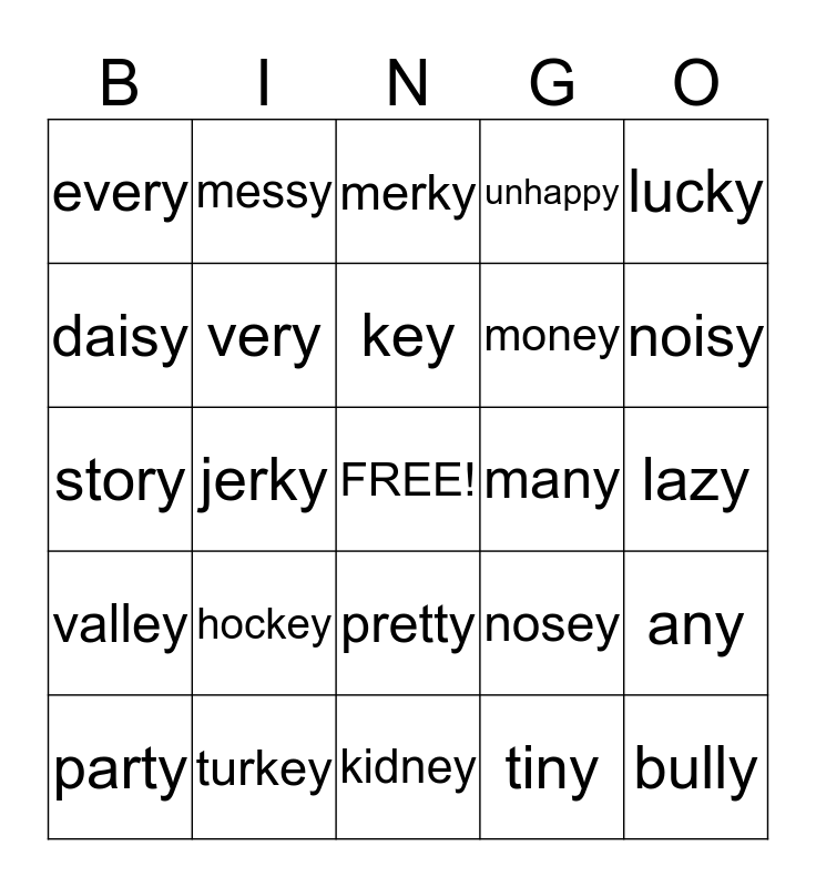 This bingo card has a free space and 24 words: hockey, turkey, key, party, lucky, every, daisy, messy, many, pretty, money, story, nosey, any, very, tiny, lazy, merky, noisy, jerky, bully, valley, unhappy and kidney.