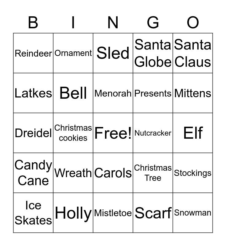 This bingo card has a free space and 24 words: Wreath, Holly, Menorah, Ice Skates, Santa Claus, Reindeer, Latkes, Ornament, Nutcracker, Carols, Presents, Dreidel, Christmas Tree, Stockings, Bell, Scarf, Elf, Sled, Mittens, Christmas cookies, Snowman, Candy Cane, Santa Globe and Mistletoe.