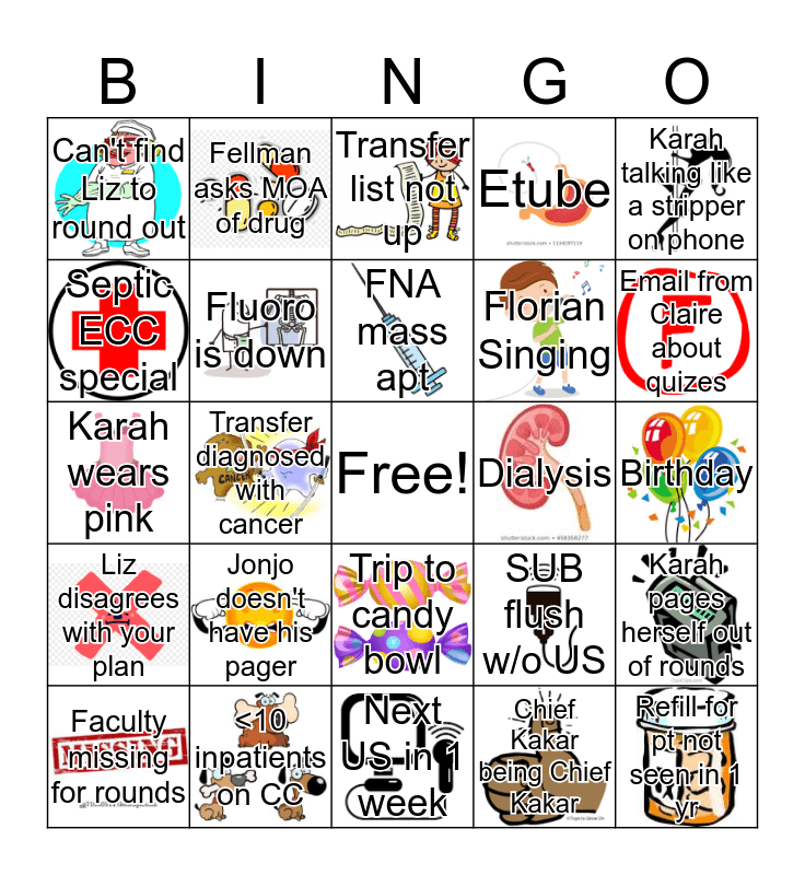 This bingo card has 24 images, a free space and 24 words: Jonjo doesn't have his pager, <10 inpatients on CC, FNA mass apt, Faculty missing for rounds, Karah talking like a stripper on phone, Can't find Liz to round out, Septic ECC special, Fellman asks MOA of drug, Dialysis, Trip to candy bowl, Florian Singing, Karah wears pink, SUB flush w/o US, Karah pages herself out of rounds, Fluoro is down, Chief Kakar being Chief Kakar, Birthday, Transfer list not up, Email from Claire about quizes, Transfer diagnosed with cancer, Refill for pt not seen in 1 yr, Liz disagrees with your plan, Etube and Next US in 1 week.