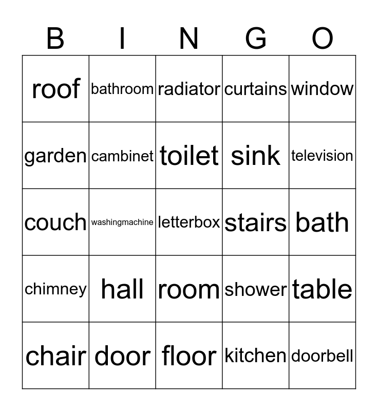 This bingo card has 26 words: room, kitchen, toilet, door, window, roof, garden, bathroom, bath, shower, sink, couch, table, chair, washingmachine, rug, curtains, chimney, radiator, letterbox, television, floor, stairs, hall, cambinet and doorbell.