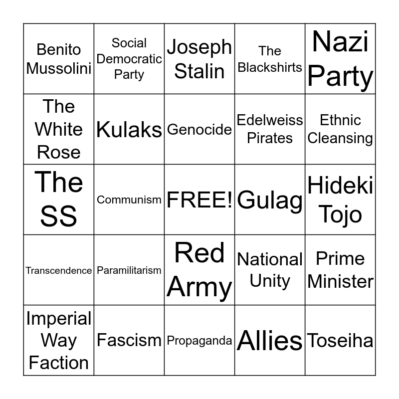 This bingo card has a free space and 30 words: Fascism, Charismatic leader, Communism, Adolf Hitler, Benito Mussolini, Joseph Stalin, Kulaks, Red Army, Gulag, Propaganda, Hideki Tojo, Toseiha, Allies, Working Class, Ethnic Cleansing, Political Cleansing, National Unity, Transcendence, Paramilitarism, Nazi Party, The SS, Gestapo, Social Democratic Party, Edelweiss Pirates, The White Rose, The Blackshirts, Prime Minister, Imperial Way Faction, Genocide and Secret Police.